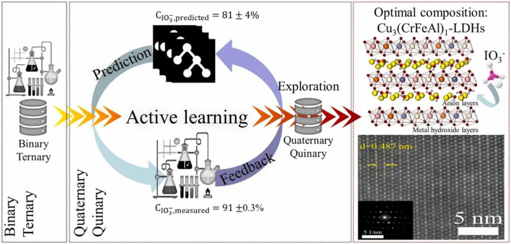 Deze gelaagde structuren staan bekend om hun vermogen om negatieve ionen – zoals jodaat – op te vangen. Het probleem: er zijn duizenden mogelijke combinaties van metaalionen waaruit LDHs kunnen worden opgebouwd. Handmatig testen zou jaren duren.