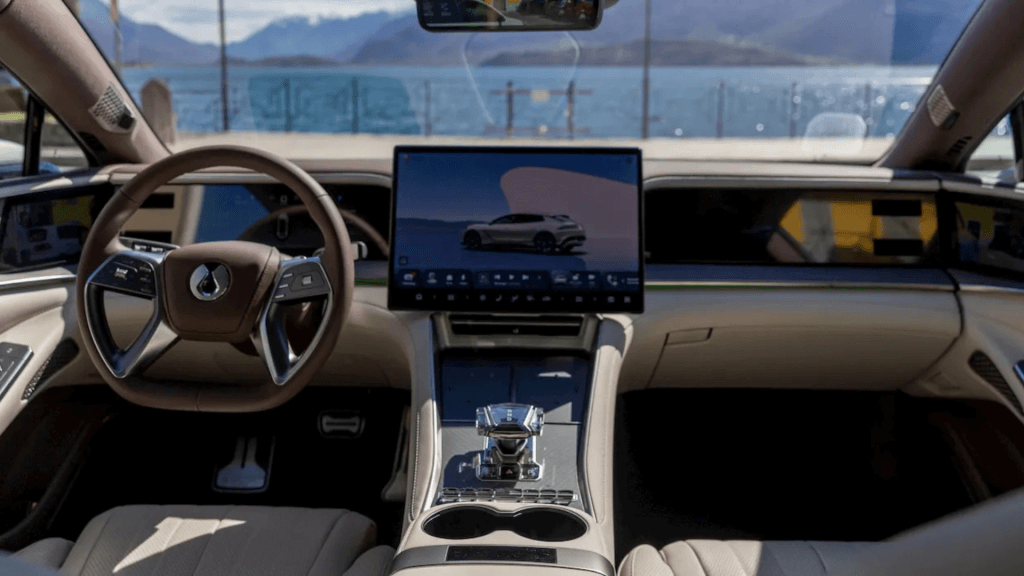 Het interieur van de Denza Z9 GT met 17,3-inch centraal touchscreen en dubbele 12,3-inch displays, aangestuurd door BYD’s DiLink-platform en gekoppeld aan het God’s Eye 5.0-rijhulpsysteem. © BYD / Denza