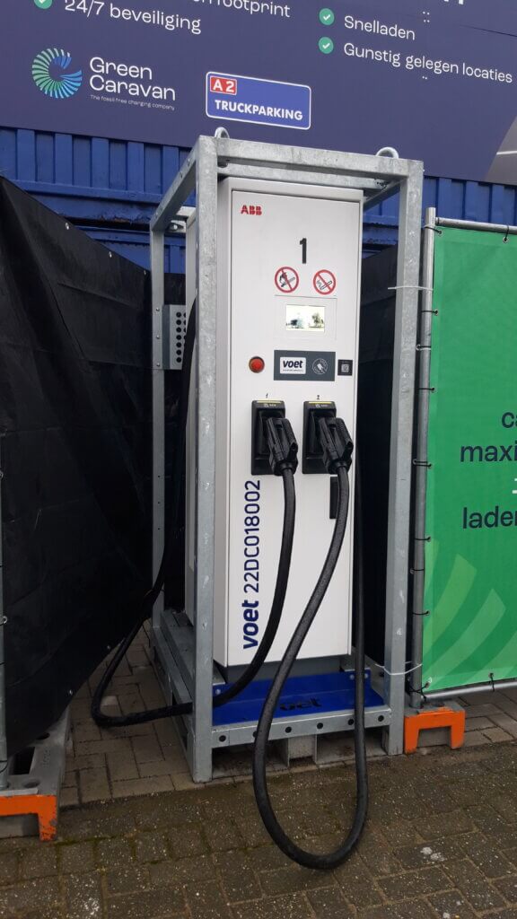 Het is een bedompte januari-ochtend op bedrijventerrein De Berk in Echt. Vrijwel windstil en de zon laat zich nergens zien. Hier ergens, aan de Röntgenweg, moet de elektrisch rijder kunnen laden. De plaat met de naam Green Caravan verdwijnt tussen de vele bedrijfsnamen en reclameborden. En ook het bordje met ‘Snellaadpunt’ en een pijl valt weinig op. Toch ligt hier, achter het gebouw van A2-truckparking, het eerste oplaadpunt van Green Caravan verscholen.