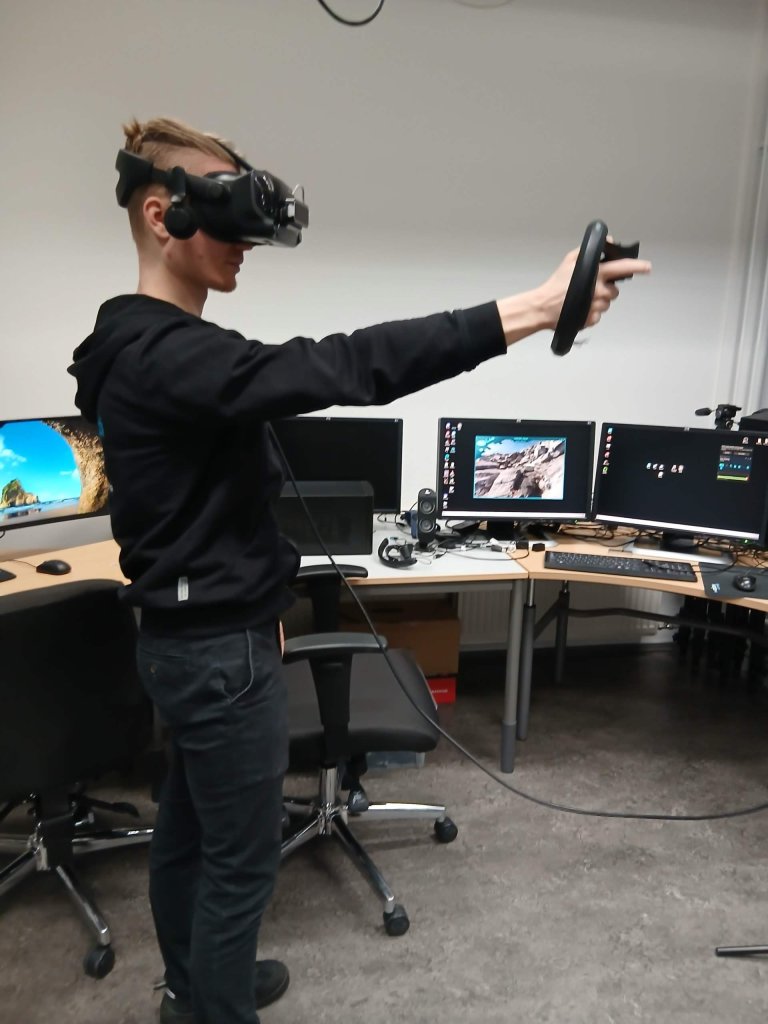In hetzelfde lab zijn er ook VR-brillen, waarbij je als buitenstaander op een scherm kunt zien waar diegene met de bril op is en wat die ziet. Dit is geen bril waarmee je ook de werkelijkheid ziet, maar puur VR. In dit geval ging het om een partij rotsen waarop je leek te staan en je kon naar voren of naar achteren lopen, dan gebeurde hetzelfde op de rots. Als je met de controller op een andere plek richtte en die werd groen, dan ‘transporteerde’ je naar die plek. ‘Als een persoon ergens geweest is en daar zijn opnames van, dan kan iedereen met de VR-bril daar ook zijn’, legt Iiro Muhonen uit, hij is projectcoördinator bij de Universiteit Oost-Finland. Zou het dan mogelijk zijn om bij een begrafenis aan de andere kant van de wereld te zijn? ‘In theorie wel, dan moeten er wel opnames worden gemaakt, maar dat zou kunnen ja. Een combinatie met bijvoorbeeld Google Maps zou een flinke uitbreiding zijn.’