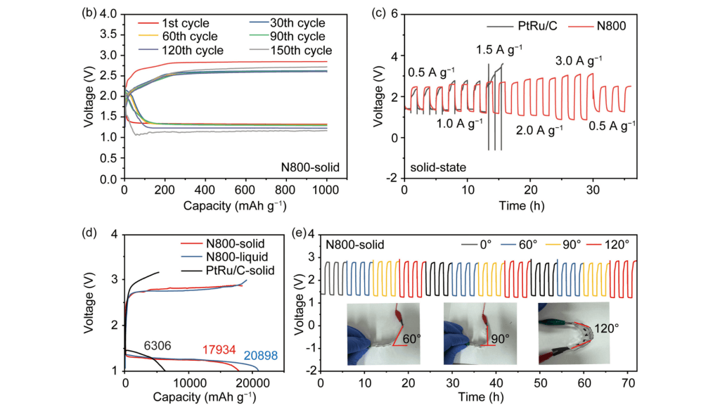 Prestaties van de nieuwe magnesium-luchtbatterij met N-doped grafeen. De gel-elektrolyt zorgt voor stabiele werking, veiligheid en behoudt prestaties zelfs bij buiging. © Chemical Engineering Journal