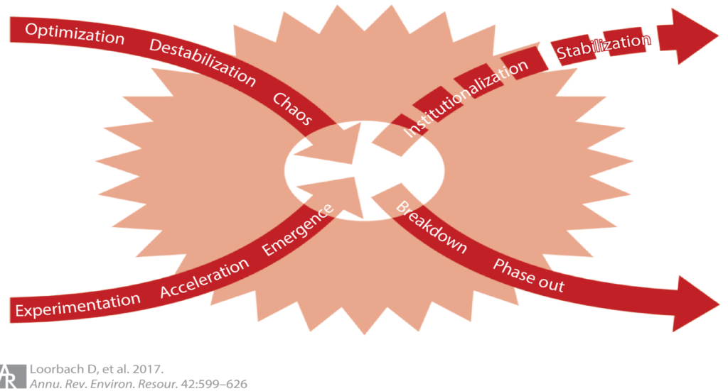 ‘Transities zijn schoksgewijze, niet-lineaire overgangen van de ene naar de andere toestand. In de systeemdynamica en mathematica spreekt men sinds Henri Poincaré (1854 – 1912) van bifurcatiepunten wanneer een kleine verandering in de parameters van een systeem een plotselinge verandering veroorzaakt. Maatschappelijk gezien duurt een transitie een of meerdere generaties. Kleine, kwalitatieve veranderingen kunnen niet langer worden opgevangen waardoor het sociale systeem steeds meer uit evenwicht raakt. Wij ervaren dat als chaotisch terwijl het kantelpunten zijn, hetzij naar ineenstorting en afbraak, hetzij naar een nieuwe, hogere orde. Het is te simplistisch om te veronderstellen dat maatschappelijke transities één kantelpunt kennen. Wij zien het meer als een proces waarin de toenemende druk leidt tot een relatief korte fase met meerdere kantelpunten.’