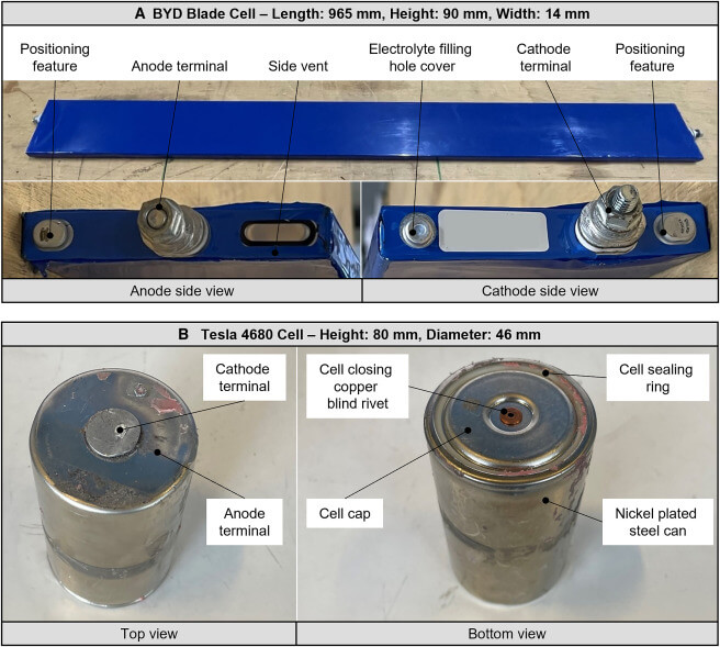 De onderzoekers namen de Tesla 4680-cel en de BYD Blade-cel onder handen. Ze analyseerden onder meer de mechanische opbouw, de samenstelling van de elektroden, het elektrische en thermische gedrag en de productiekosten van de gebruikte materialen. Een van de verrassingen was het ontbreken van silicium in de anodes van beide cellen. Dit is opmerkelijk omdat silicium vaak wordt gezien als een sleutelcomponent om de energiedichtheid van batterijen te verhogen.