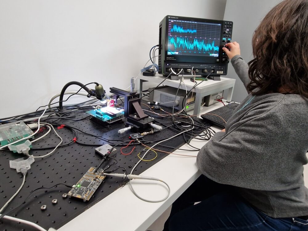 Op een tafel en omringd door apparatuur ligt een kaart met chip op z’n rug. Medewerkers proberen de code te kraken.