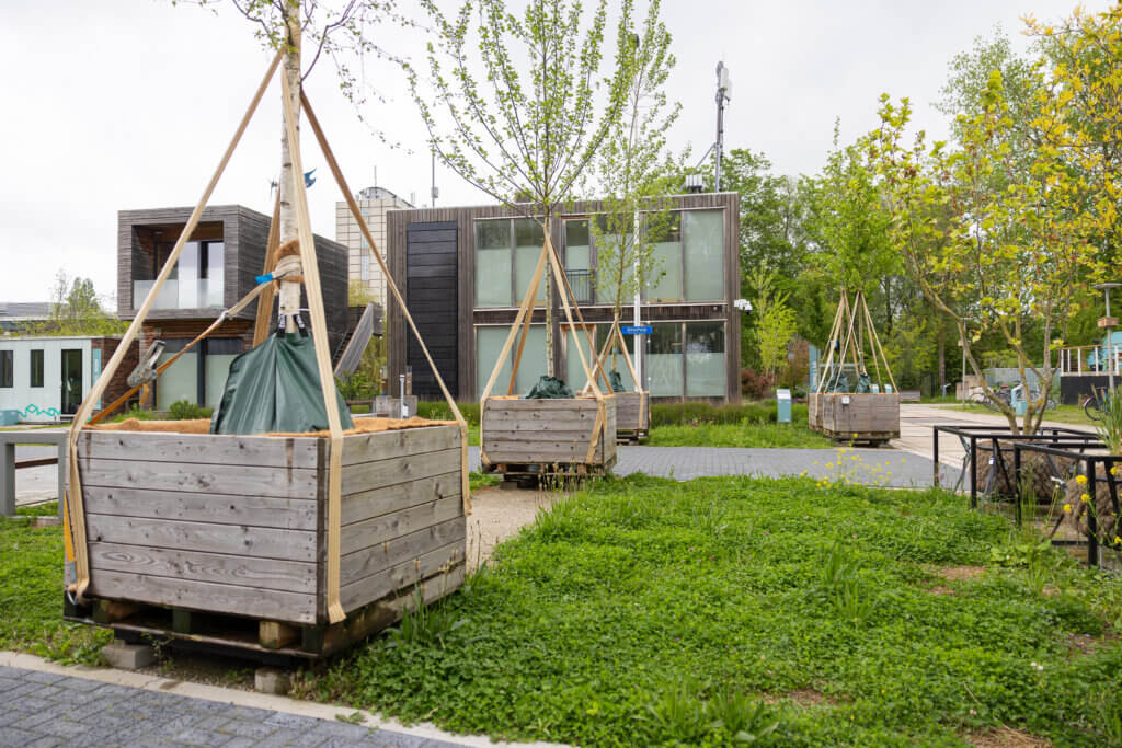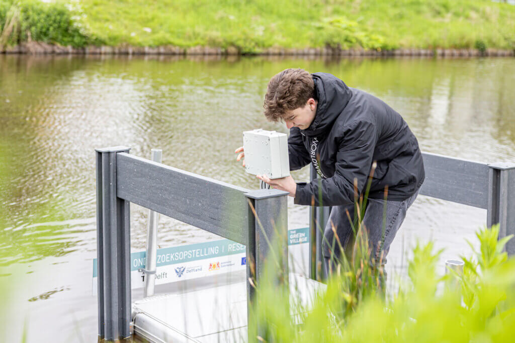 In de WaterStraat testen bedrijven innovaties gericht op wateroverlast en slim omgaan met regenwater. Er liggen stelconplaten die eenvoudig in en uit de straat te halen zijn. ‘Een jaar of zes geleden was wateroverlast een heel groot thema, we zijn toen met waterbuffers onder de straat gaan testen. Sommigen zijn doorontwikkeld en liggen er nog steeds. Voor gemeentes en in mindere mate bedrijven is dit een bekend thema, voor de individuele burger nauwelijks. Die zien wel het steeds extremere weer, hitte is een voelbaar thema. In klimaatadaptieve pleinen kun je deze thema’s mooi combineren, uiteraard met zoveel mogelijk groen.’ The Green Village is omringd door een sloot, die ook gebruikt wordt. ‘De waterkwaliteit is heel slecht in Nederland en wat is er beter dan mensen dit zelf te laten ontdekken? Het liefst zouden we willen dat iedereen thuis het water uit de sloot kan testen. In het water hier hebben we sensoren hangen die allerlei waterkwaliteitsindicatoren meten, zoals de zuurgraad.’