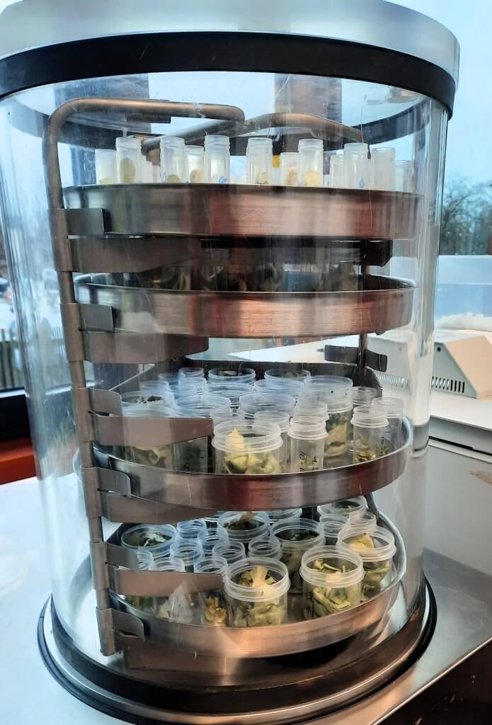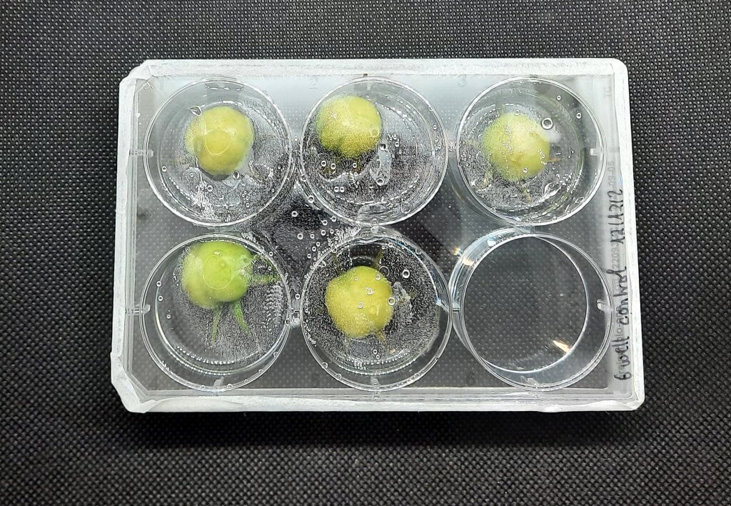 Ook is hij nog niet begonnen met weefsel, zoals uiteindelijk de bedoeling is. Hij heeft de minitomaatjes van de planten in het lab geplukt tien dagen na de bestuiving. Dit gebeurt in het lab niet met insecten, maar met een tandenborstel. Omdat deze tomaatjes dus ouderwets aan een plant hebben gegroeid, zijn de tomaatjes groen wanneer deze technologie praktijkrijp is, blijven ze wit tot ze rijp en rood zijn. Het doel is namelijk dat de vrucht wordt opgetrokken uit stamcellen, aanwezig in eender welk weefsel van de plant. Met de juiste groeihormonen en met straling wordt vervolgens gestuurd dat het uitgroeit tot de vrucht van de plant. En niet bijvoorbeeld een blad of wortel.